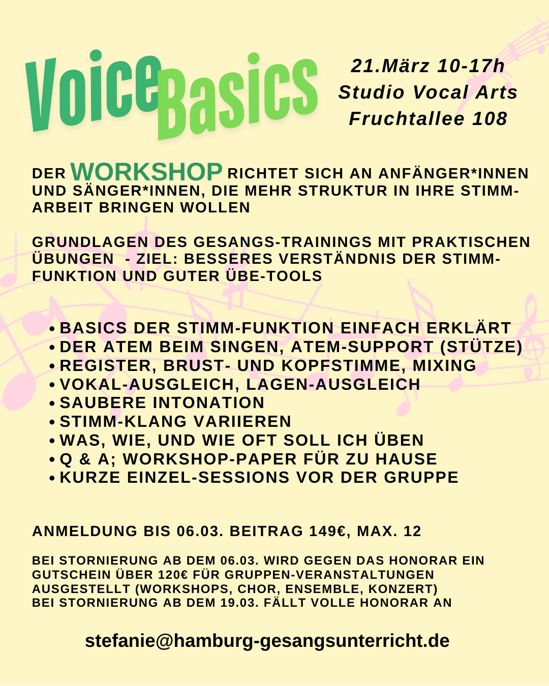 Zusammenklang, Intonation, Groove, musikalische Arbeit, Gruppenpräsentation, Repertoireberatung, Arrangement, Konzept. Organisation; Einführung in Ensemble-Gesang